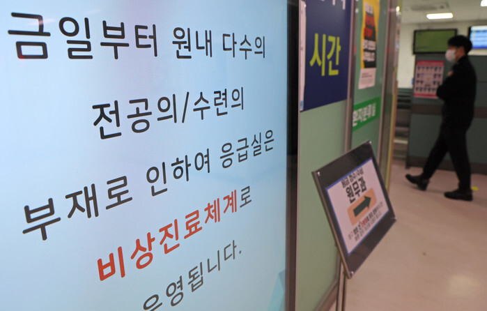 A notice at the entrance of the emergency room inside Jeju National University Hospital in the city of Jeju on South Korea's largest island of the same name on Feb. 20, 2024, informs people that the ER is being operated in an emergency mode due to the absence of many trainee doctors. A total of 6,415 out of the country's around 13,000 trainee doctors at 100 hospitals have submitted their resignations in protest of a government plan to boost the number of medical students. (Yonhap)
