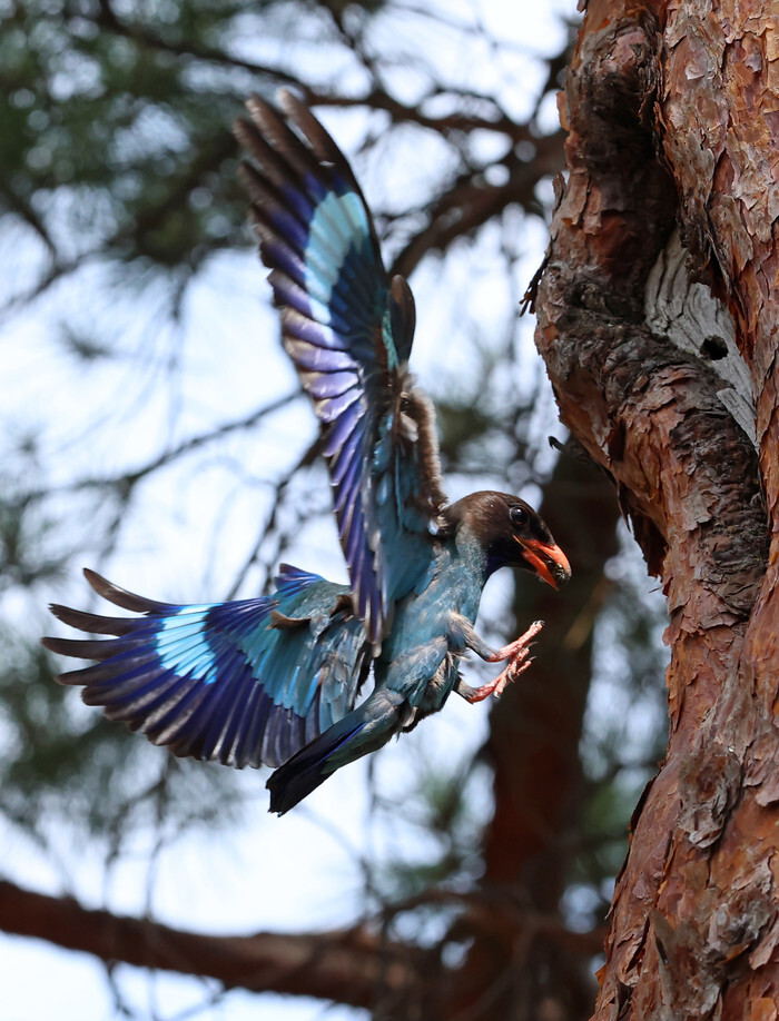 A bluebird brings prey back to its chick inside a pine tree in Gangneung, Gangwon Province, northeastern South Korea, on July 22, 2025. (Yonhap)