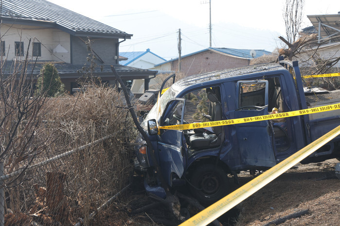 A destroyed truck is seen at the site of an accidental fighter jet bombing over a village in Pocheon, some 40 kilometers north of Seoul, on March 7, 2025, one day after the Air Force's two KF-16 fighter jets mistakenly released eight MK-82 air-to-surface bombs outside a training range, leaving 15 civilians and 14 soldiers injured. (Yonhap)