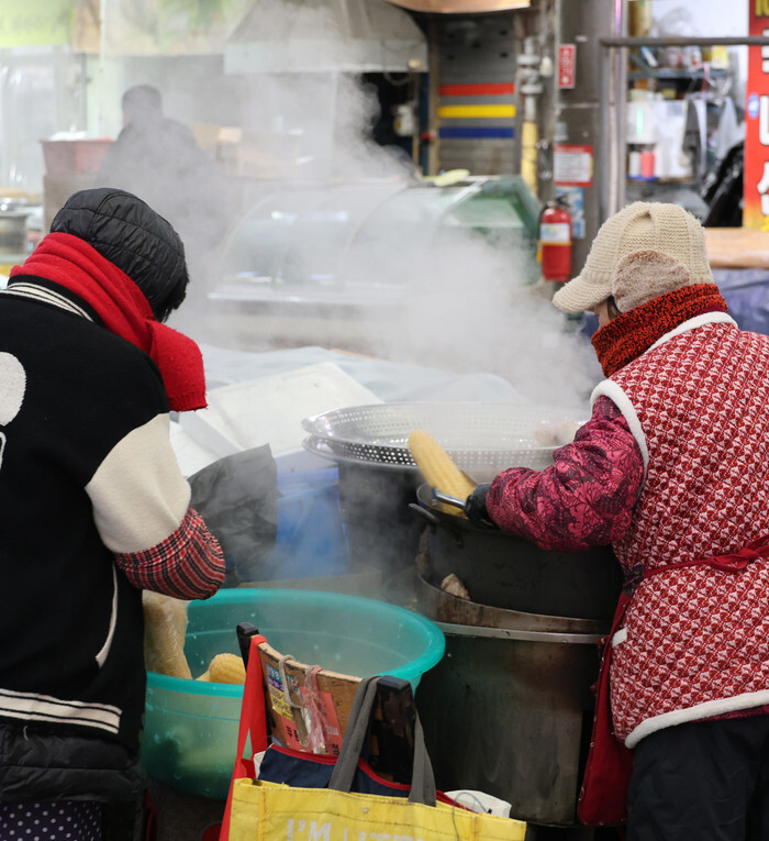 Shopkeepers steam ears of corn at a traditional market in Jeonju, North Jeolla Province, southwestern South Korea, on Jan. 20, 2026, amid a cold spell gripping the country. (Yonhap)
