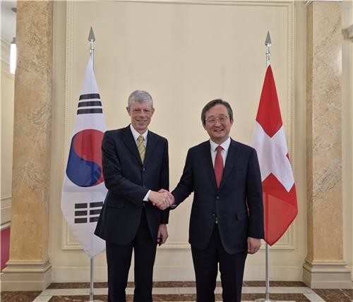 Deputy Foreign Minister for Political Affairs Chung Byung-won (R) shakes hands with Heinrich Schellenberg, Switzerland's assistant state secretary for the Asia-Pacific region, as they hold bilateral policy talks for the first time in six years in Bern on April 11, 2025, in this photo provided by Seoul's foreign ministry the next day. (PHOTO NOT FOR SALE) (Yonhap)