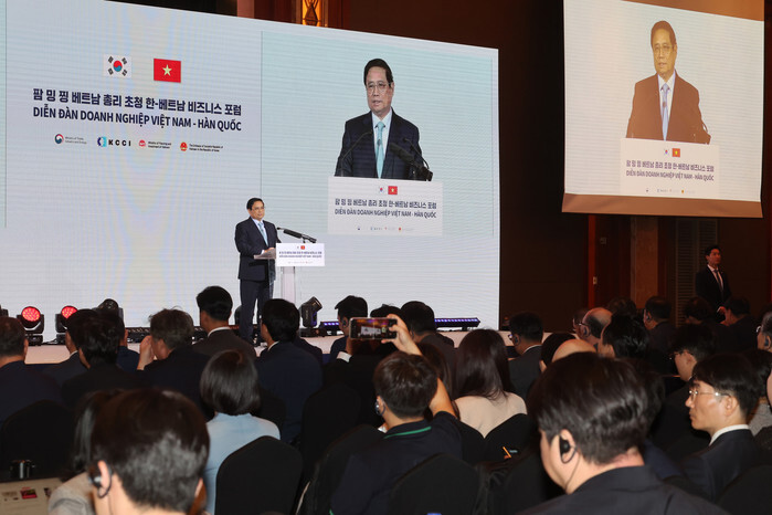 Vietnamese Prime Minister Pham Minh Chinh delivers a speech during the South Korea-Vietnam Business Forum in Seoul on July 1, 2024. (Yonhap)