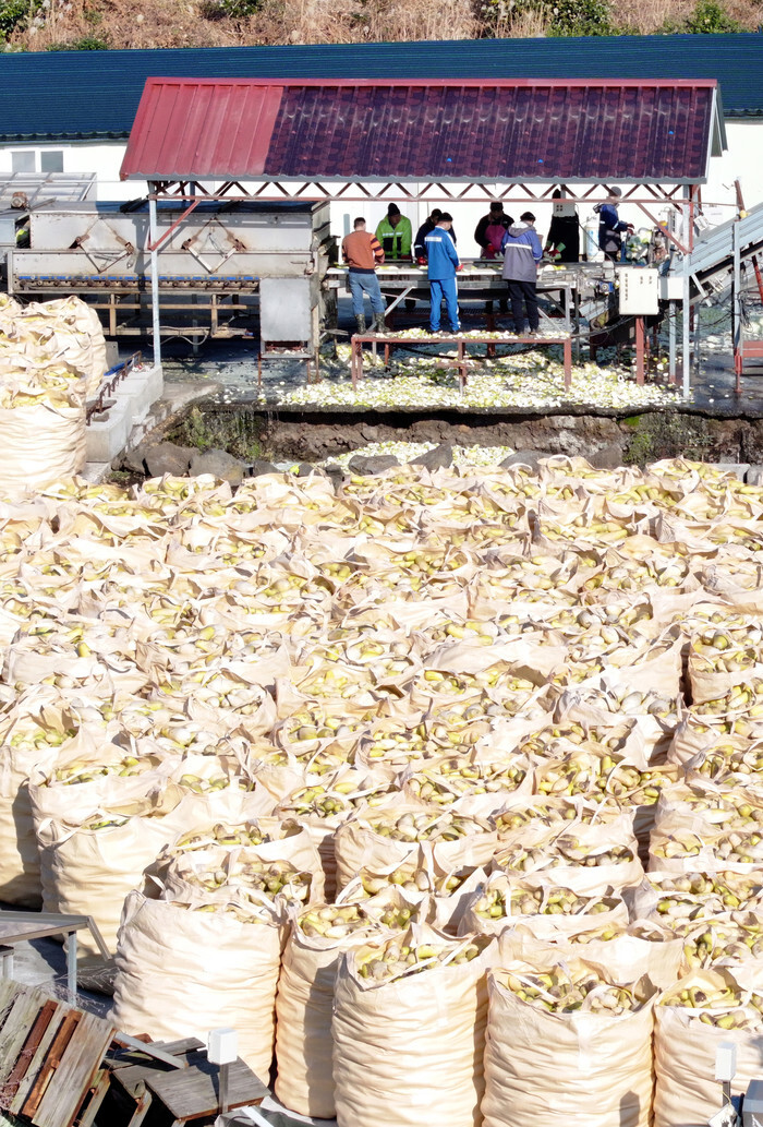 Farmers prepare to ship packages of dried strips of radish at a farm in the city of Seogwipo on South Korea's largest island of Jeju on Dec. 29, 2025. Dried strips of radish, called "mumallaengi" in Korean, are one of the popular Korean side dishes. (Yonhap)