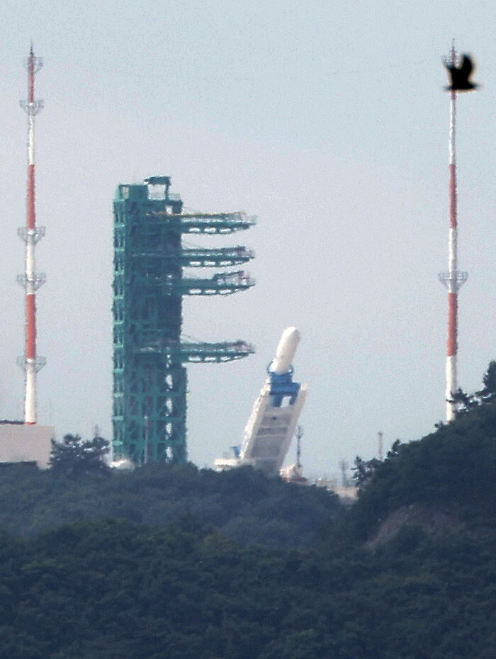 Work to erect the Korea Space Launch Vehicle-II (KSLV-II), also called Nuri, is under way for launch at the Naro Space Center in Goheung, some 330 km south of Seoul, on June 15, 2022. The homegrown space rocket is scheduled to be launched the following day, eight months after the first trial in October ended in partial success. (Yonhap)
