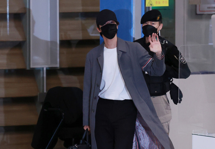 Jin, a member of South Korean boy group BTS, waves toward fans upon arrival at Incheon International Airport, west of Seoul, on Dec. 6, 2021, from a trip to the United States for the septet's concerts at SoFi Stadium in Los Angeles. (Yonhap)