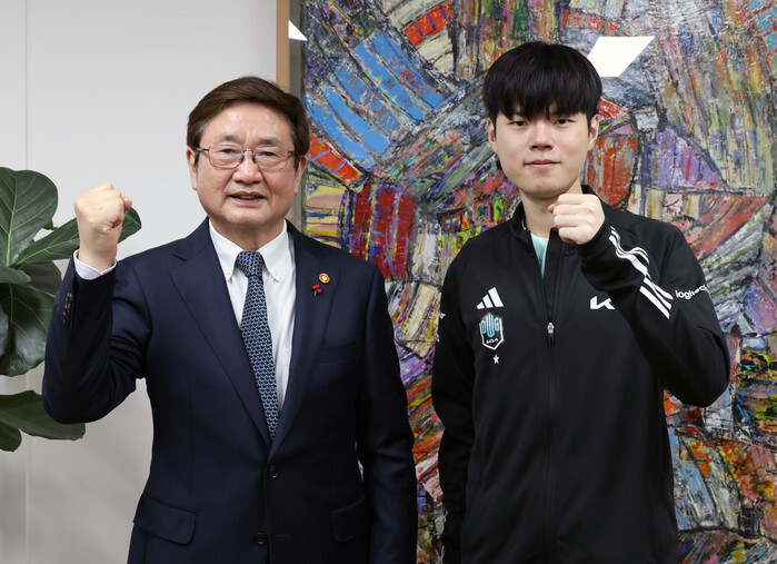 Culture Minister Park Bo-gyoon (L) poses for a photo with pro gamer Kim Hyuk-kyu, better known as Deft, who won the 2022 League of Legends World Championship, in Seoul on Dec. 15, 2022, in this photo provided by the ministry. (PHOTO NOT FOR SALE) (Yonhap)