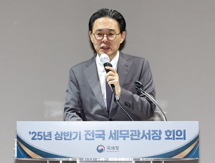 Kang Min-soo, chief of the National Tax Service, speaks during a meeting of representatives from the tax agency's regional offices nationwide at the government complex in Sejong, central South Korea, on Jan. 22, 2025. (Yonhap)