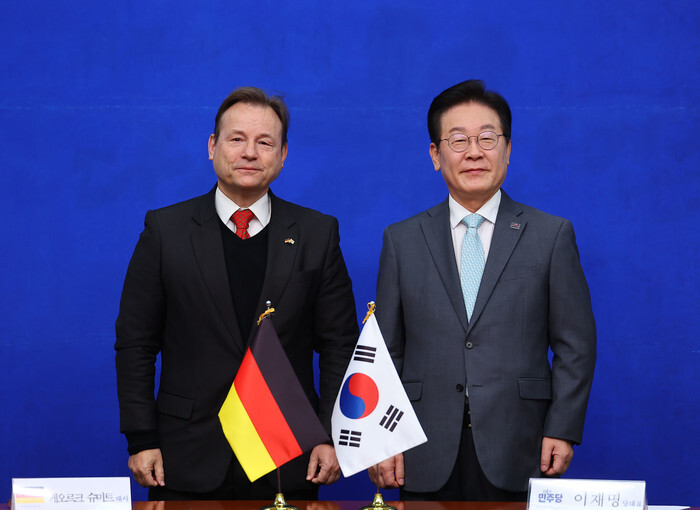 Lee Jae-myung (R), chief of the main opposition Democratic Party, poses for a photo with German Ambassador to South Korea Georg Schmidt during their meeting at the National Assembly in Seoul on Feb. 6, 2025. (Yonhap)