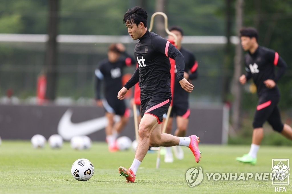 ▲ Song Min-kyu of the South Korean men's national football team trains at the National Football Center in Paju, Gyeonggi Province, on June 7, 2021, in this photo provided by the Korea Football Association. (PHOTO NOT FOR SALE) (Yonhap)