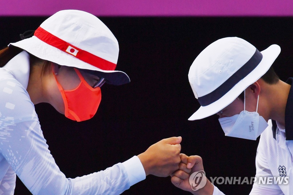 | ▲ In this Reuters photo, Ren Hayakawa of Japan (L) bumps fists with An San of South Korea before their match n the round of 16 in the women's archery individual event at the Tokyo Olympics at Yumenoshima Park Archery Field in Tokyo on July 30, 2021. (Yonhap) |