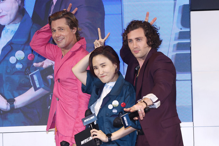 Hollywood actors Brad Pitt (L) and Aaron Taylor-Johnson (R) -- along with entertainer Park Kyung-rim (C) pose for a photo during a publicity event for the new movie "Bullet Train" in Seoul on Aug. 19, 2022. The movie will be released in South Korea on Aug. 24. (Yonhap)