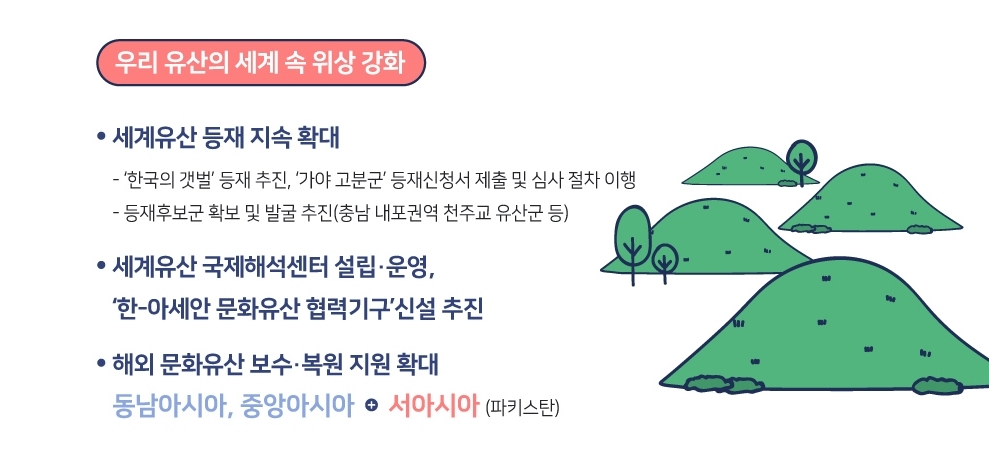 아울러 우리 문화유산의 위상 강화를 위해 '한국의 갯벌' 등 우리 유산의 유네스코 세계유산 등재를 확대하고, 세계유산국제해석센터 건립을 추진한다. 파키스탄 간다라 유산 활용 콘텐츠 제작, 우즈베키스탄 유물 보존처리 등 해외 문화유산에 대한 기술 지원도 확대한다.