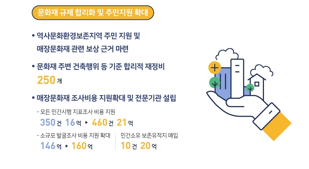 이에 문화재청은 문화재보호법을 개정해 환경개선·복리증진·교육문화시설 마련·세제 혜택 등 주민 지원을 강화할 계획이다. 또 도심 유적지나 매장문화재 보존 유적은 역사문화공원 등으로 조성한다.