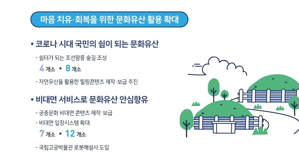 신종 코로나바이러스 감염증(코로나19)과 관련해 궁궐과 조선왕릉의 비대면 입장시스템을 확대하고, 국립고궁박물관에는 안내해설과 방역 기능을 갖춘 '인공지능 로봇해설사'를 도입한다. 또 기존 궁중문화축전은 연 2회로, 조선왕릉문화제는 10개소 28개 프로그램으로 각각 확대 운영한다.