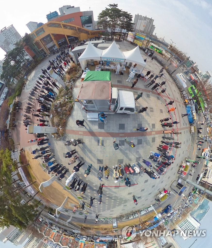 | ▲ This photo taken with a 360-degree camera shows people standing in line to receive coronavirus tests at a makeshift clinic in front of a train station in Seoul on March 19, 2021. (Yonhap) |