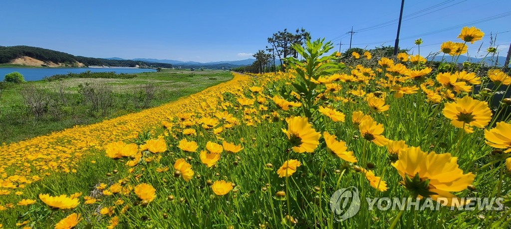 | ▲ 남대천변에 만발한 금계국 (양양=연합뉴스) 이종건 기자 = 맑고 화창한 날씨를 보인 30일 강원 양양 남대천변에 만발한 금계국이 파란 하늘과 어울려 한 폭의 풍경화를 연출하고 있다. 2021.5.30 momo@yna.co.kr |