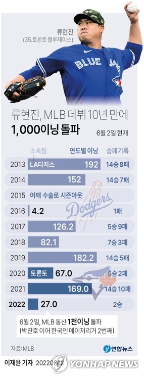 | ▲ [그래픽] 류현진 MLB 데뷔 10년 만에 1,000이닝 돌파 (서울=연합뉴스) 이재윤 기자 = 류현진은 2일(한국시간) 캐나다 온타리오주 토론토의 로저스센터에서 열린 2022 미국프로야구 메이저리그(MLB) 시카고 화이트삭스와의 홈 경기에 선발 등판해 1회 아웃카운트 2개를 추가해 '코리안 특급' 박찬호(1천993이닝)에 이어 역대 한국인 빅리거 중 두 번째로 1천 투구 이닝 고지를 밟았다. yoon2@yna.co.kr 트위터 @yonhap_graphics 페이스북 tuney.kr/LeYN1 |
