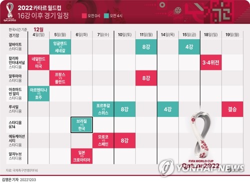| ▲ [그래픽] 2022 카타르 월드컵 16강 이후 경기 일정 (서울=연합뉴스) 김영은 기자 = 한국 축구가 2022년 카타르 월드컵 조별리그 3차전에서 강호 포르투갈에 극적인 역전승을 거두고 12년 만에 월드컵 16강 진출을 이뤘다. 한국의 16강 상대는 월드컵 최다(5회) 우승국인 세계 최강 브라질이다. 0eun@yna.co.kr 트위터 @yonhap_graphics 페이스북 tuney.kr/LeYN1 |