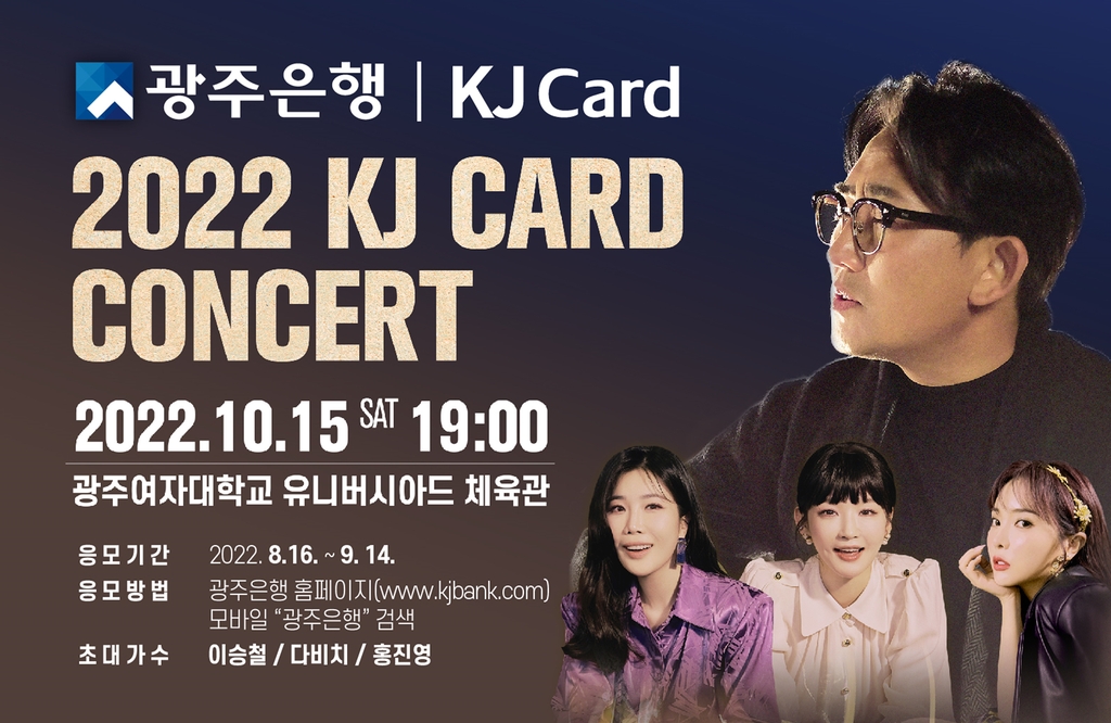(광주=연합뉴스) 송형일 기자 = 광주은행은 코로나19 여파로 중단했던 '2022 KJ 카드 콘서트'를 3년 만인 오는 10월 15일 광주여대 유니버시아드 체육관에서 다시 연다고 18일 밝혔다.