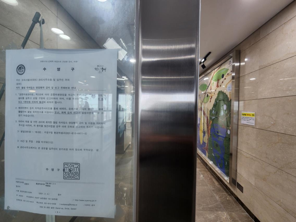 출입문에는 관할구청인 수영구가 부착한 불법 숙박 영업 행위 금지 안내문이 곳곳에 보였다.