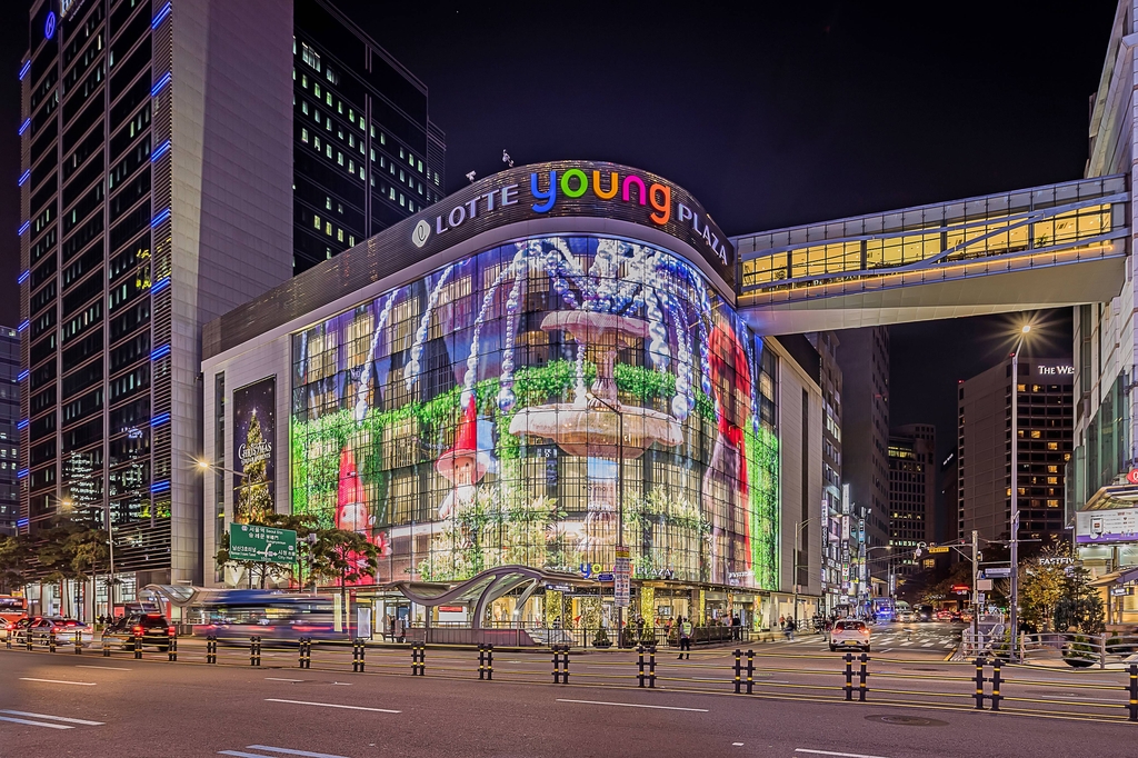 롯데백화점은 소공동 본점 쇼윈도 전체를 크리스마스 테마로 꾸몄고 외벽에는 100m 이상 파사드를 3층 높이로 새로 구축했다.