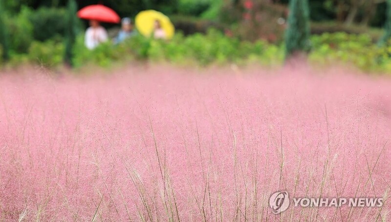 | ▲ 가을, 핑크뮬리의 계절 (서귀포=연합뉴스) 제주 서귀포시 안덕면 덕수리 카페 마노르블랑을 찾은 관광객이 활짝 핀 핑크뮬리를 감상하고 있다. [연합뉴스 자료사진] |