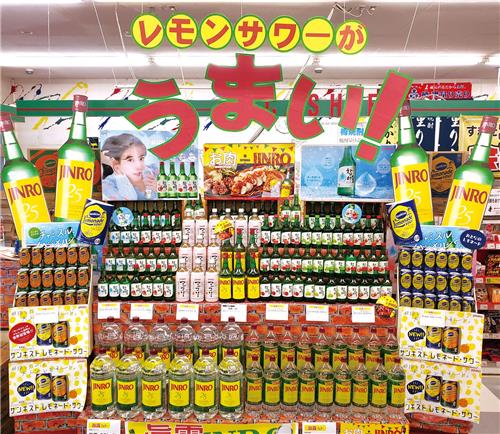 | ▲ This undated file photo offered by Hitejinro shows its Jinro soju products displayed at a large discount store outlet in Japan. (PHOTO NOT FOR SALE) (Yonhap) |