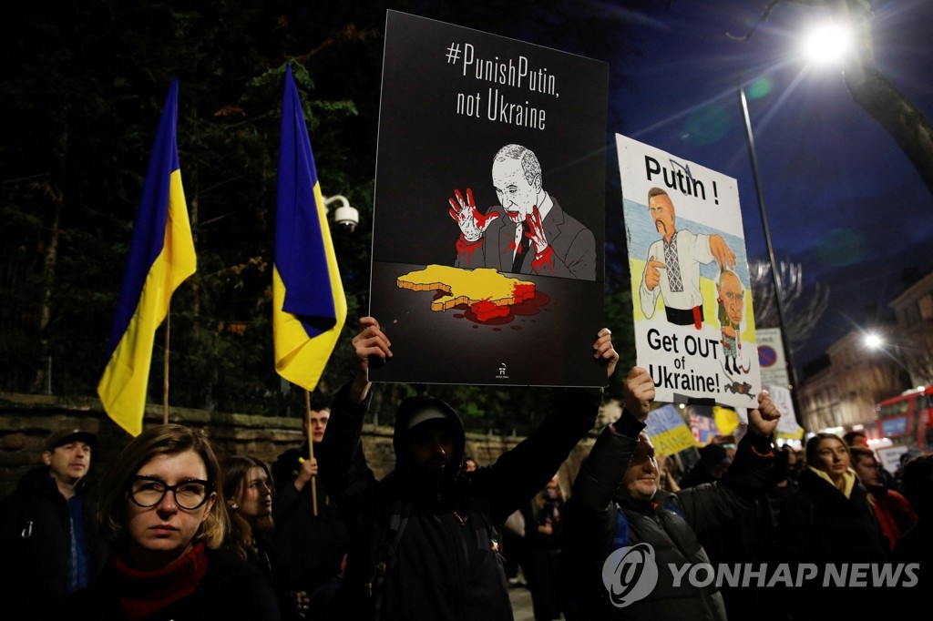 | ▲ '우크라에서 나가라!'…러시아 대사관 앞에서 시위하는 영국인들 (런던 로이터=연합뉴스) 23일(현지시간) 영국 수도 런던의 러시아 대사관 앞에서 친(親)우크라이나 시위대가 '푸틴! 우크라이나에서 나가라!'라고 쓰인 팻말과 우크라이나 국기를 들고 시위하고 있다. 블라디미르 푸틴 러시아 대통령은 최근 우크라이나 동부 돈바스 지역 친러 분리주의자들이 결성한 도네츠크인민공화국(DPR)과 루간스크인민공화국(LPR)의 독립을 승인하고 평화유지를 명분으로 자국군에 이 지역 진입을 명령했다. 2022.2.24 sungok@yna.co.kr |