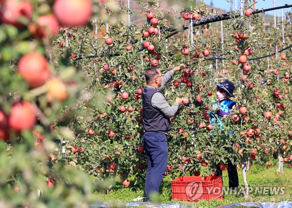 | ▲ 밀양 얼음골의 가을 (밀양=연합뉴스)지난 2일 경남 밀양시 산내면 삼양리 미래농원에서 정인섭 씨 부부가 빨갛게 익은 얼음골 사과를 수확하고 있다. 밀양 얼음골 사과는 지리적 표시제로 보도받을 정도로 맛이 뛰어나다. 2022.11.3 [밀양시 제공. 재판매 및 DB 금지] seaman@yna.co.kr |