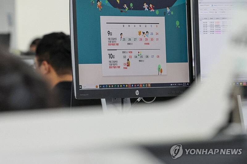 | ▲ 추석~개천절 6일 황금연휴 생길까? (서울=연합뉴스) 신현우 기자 = 28일 오후 서울 중구 모두투어 본사에서 직원들이 업무를 보고 있다. 이날 국민의힘은 추석 연휴와 개천절 사이 징검다리 연휴 중 비휴일인 10월 2일을 임시공휴일로 지정해줄 것을 정부에 공식 요청했다. 오는 9월 28일부터 10월 1일까지 나흘간 이어지는 추석 연휴와 10월 3일 개천절 사이를 공휴일로 지정할 경우 총 6일간의 연휴가 생기게 된다. 2023.8.28 nowwego@yna.co.kr |