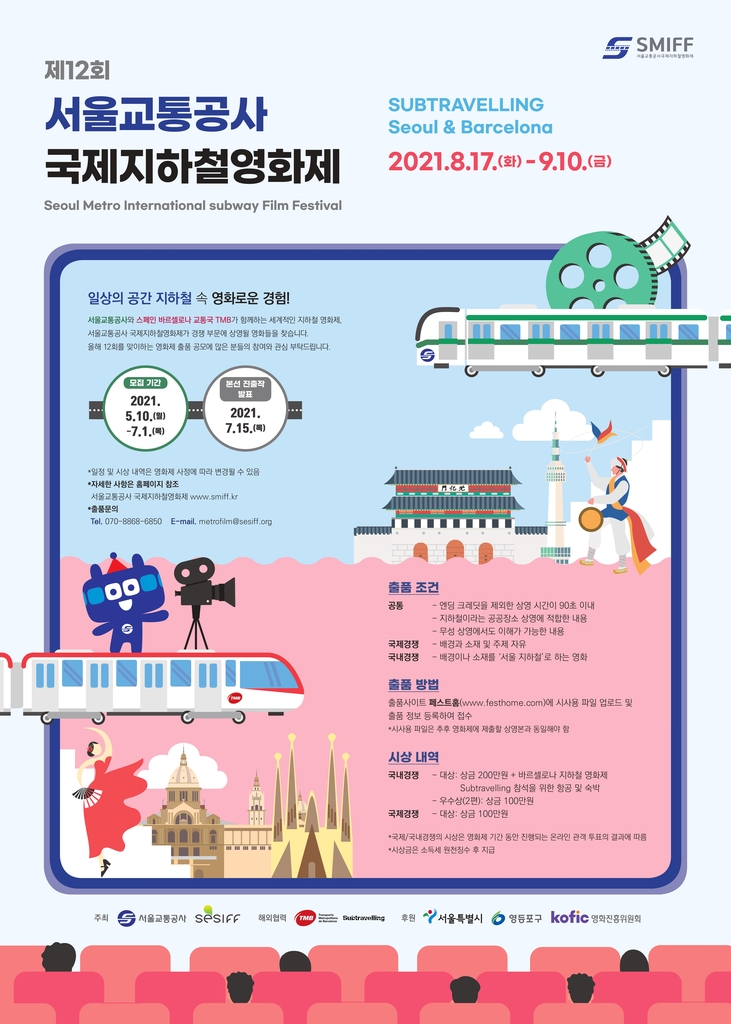 ▲ 서울교통공사는 '제12회 서울교통공사 국제지하철영화제'(SMIFF) 출품작을 7월 1일까지 공모한다. 국내경쟁 부문 주제는 '서울 지하철'이며, 국제경쟁 부문은 주제 제한이 없다. 지하철 내 상영을 위해 소리 없이 영상만으로 내용을 이해할 수 있는 구성이어야 한다. 접수는 온라인 출품사이트 페스트홈(www.festhome.com)을 통해 진행된다. 자세한 내용은 국제지하철영화제 누리집(www.smiff.kr)을 참고하면 된다. (서울=연합뉴스)