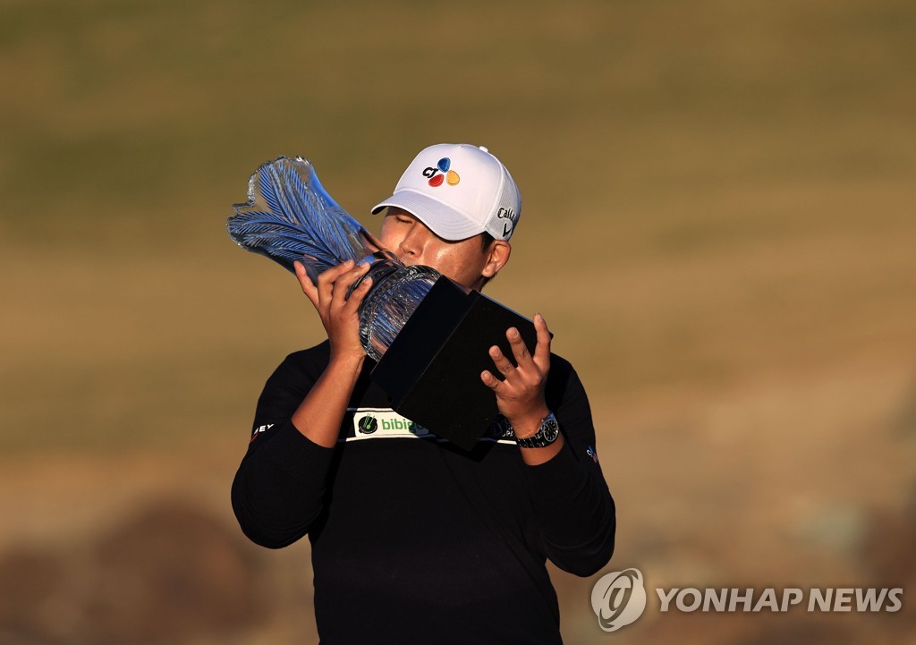 | ▲ In this Associated Press photo, Kim Si-woo of South Korea kisses the champion's trophy after winning the American Express tournament on the Stadium Course at PGA West in La Quinta, California, on Jan. 24, 2021. (Yonhap) |