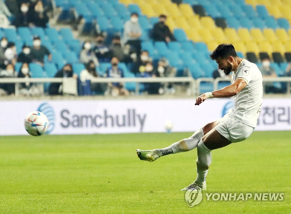 | ▲ In this file photo from May 17, 2022, Cesinha of Daegu FC scores a free kick goal against Incheon United during the clubs' K League 1 match at Incheon Football Stadium in Incheon, 30 kilometers west of Seoul. (Yonhap) |