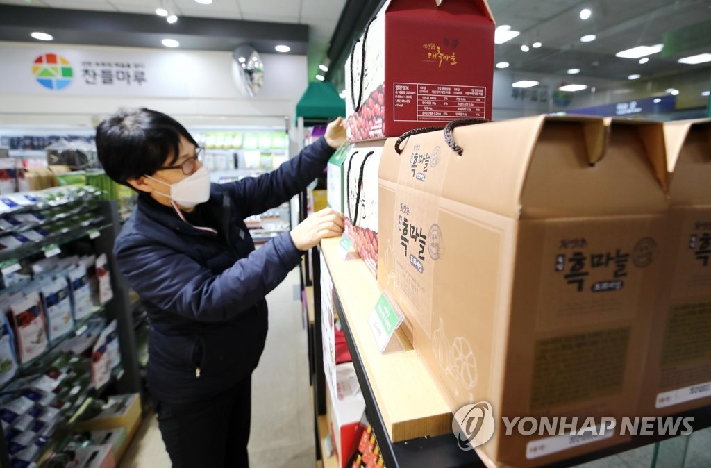 | ▲ 설 선물은 우리 농식품으로 (서울=연합뉴스) 이재희 기자 = 25일 오후 서울 용산역 내 농공상기업제품 전용판매관인 찬들마루에서 직원이 상품을 진열하고 있다. 2021.1.25 scape@yna.co.kr |
