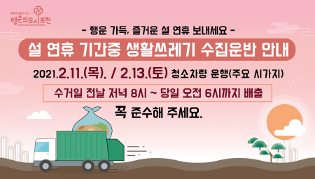 또한, 설 연휴가 시작되는 11일과 연휴 끝 무렵인 13일에 관내 생활폐기물을 수집·운반해 시민 불편이 발생하지 않도록 대처한다.