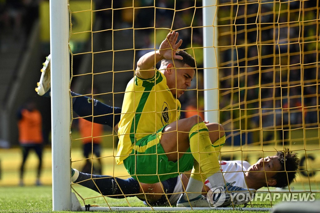 | ▲ 허탈한 웃음 짓는 손흥민 (AFP=연합뉴스) 득점왕 경쟁 중인 손흥민(30·토트넘)이 23일(한국시간) 영국 노리치의 캐로 로드에서 열린 노리치 시티와의 2021-2022시즌 EPL 최종 38라운드에서 후반 17분 골 찬스를 놓친 뒤 허탈해하고 있다. 2022.5.23 photo@yna.co.kr |