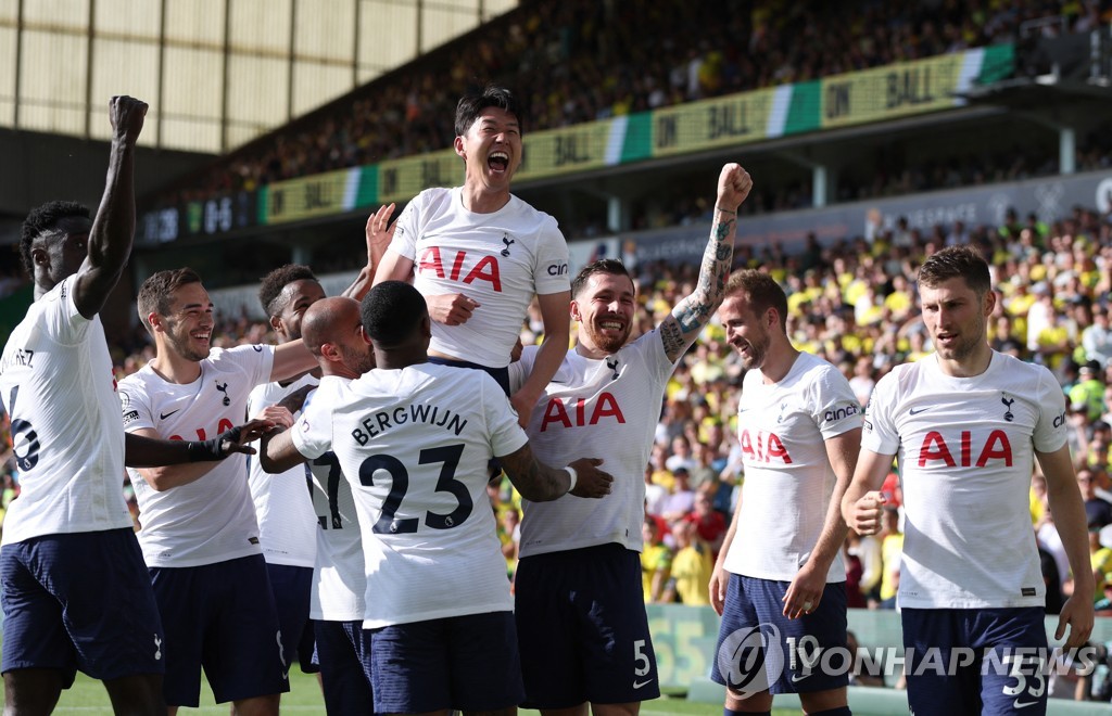 | ▲ 손흥민, 아시아인 첫 EPL 득점왕 우뚝…토트넘 3년만에 UCL 진출 (로이터=연합뉴스) 득점왕 경쟁 중인 손흥민(30·토트넘)이 23일(한국시간) 영국 노리치의 캐로 로드에서 열린 노리치 시티와의 2021-2022시즌 EPL 최종 38라운드에서 후반 30분 시즌 23호 골을 넣자 동료들이 들어 올리며 축하해주고 있다. 2022.5.23 photo@yna.co.kr |