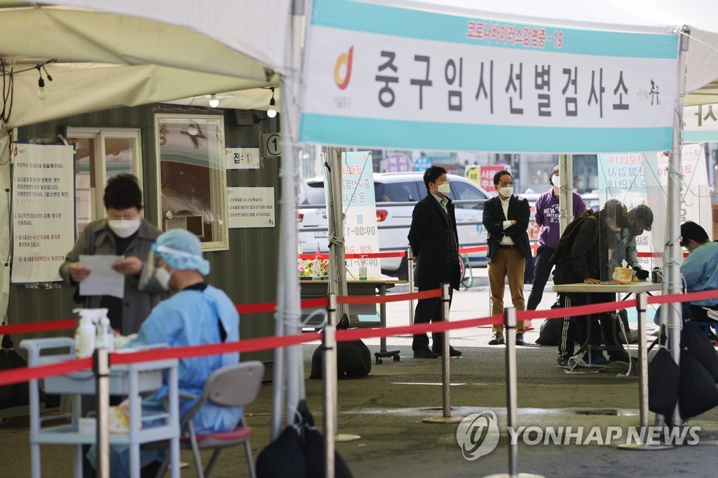 | ▲ Visitors wait to receive COVID-19 tests at a makeshift clinic in central Seoul on April 9, 2021. (Yonhap) |