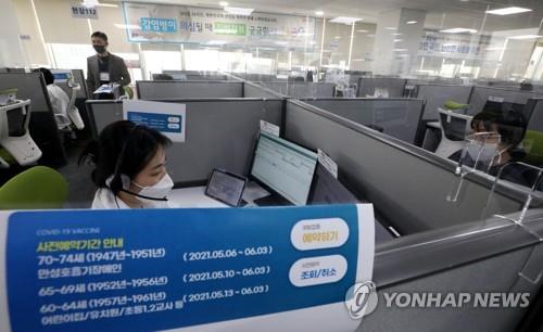 | ▲ A worker at a call center in Seoul on May 6, 2021, accepts reservations from people aged 70-74 who want to be inoculated with AstraZeneca's vaccine. (Yonhap) |