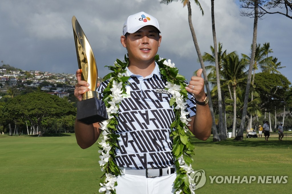 | ▲ 김시우, PGA 투어 소니오픈 역전 우승…투어 통산 4승 (호놀룰루 AP=연합뉴스) 김시우(28·CJ대한통운)가 15일(현지시간) 미국 하와이주 호놀룰루의 와이알레이 컨트리클럽(파70·7천44야드)에서 열린 미국프로골프(PGA) 투어 소니오픈(총상금 790만 달러) 마지막 라운드를 마치고 우승 트로피를 들고 있다. 대회 마지막 라운드에서 버디 8개와 보기 2개로 6언더파 64타를 친 김시우는 최종합계 18언더파 262타를 기록해 헤이든 버클리(미국)를 1타 차로 제치고 정상에 올랐다. 이번 우승으로 김시우는 투어 통산 4승을 달성했다. 2023.01.16 jason3669@yna.co.kr |