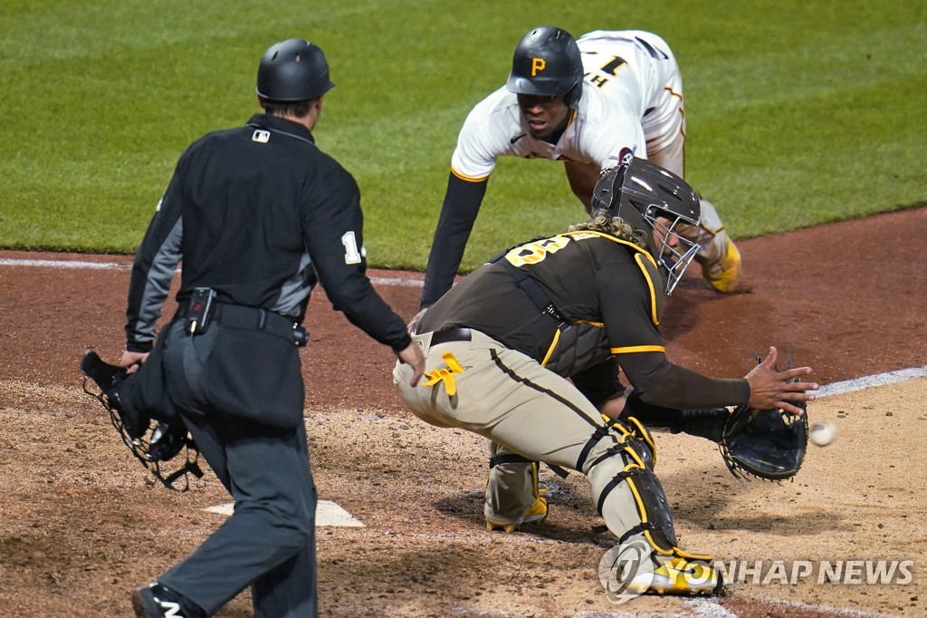 | ▲ 홈으로 내달리는 헤이스 (피츠버그 AP=연합뉴스) 피츠버그 키브라이언 헤이스가 1일(한국시간) 미국 피츠버그 PNC파크에서 열린 샌디에이고 파드리스와의 홈경기, 연장 10회말 홈으로 파고들고 있다. |