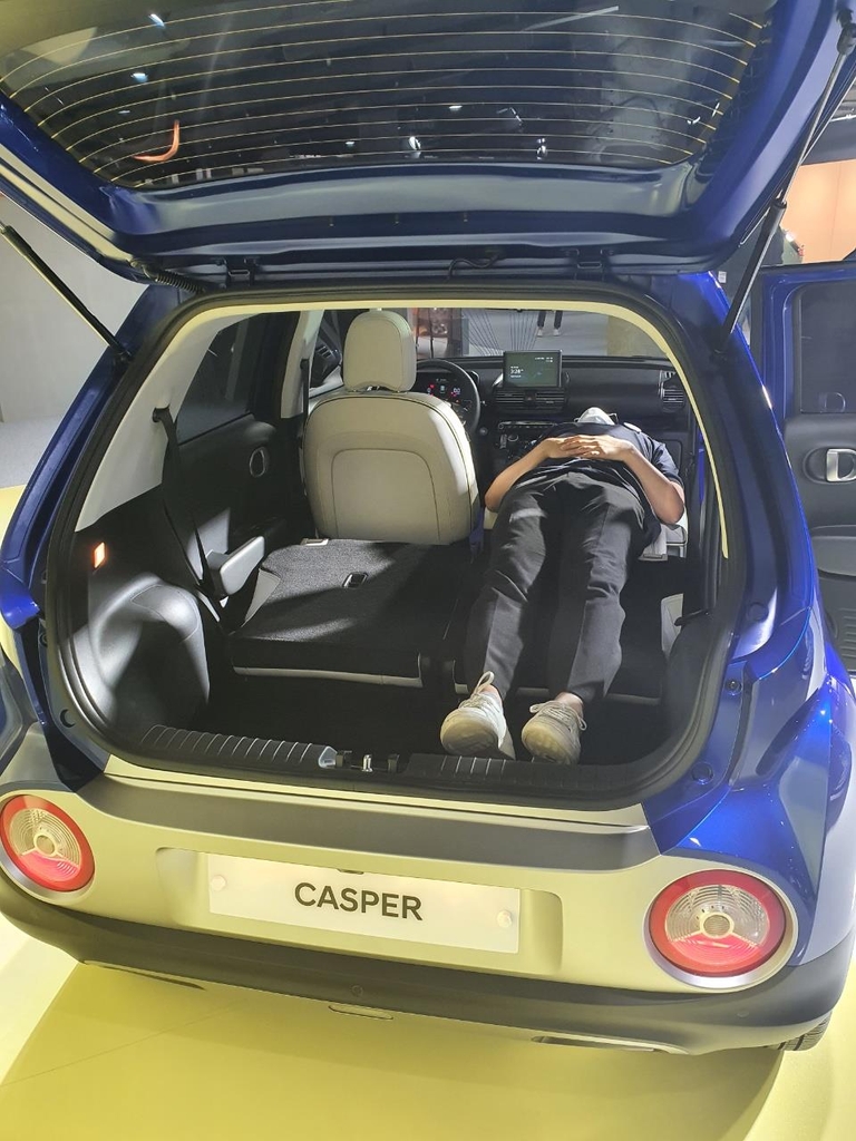| ▲ 캐스퍼 1·2열 좌석을 접은 뒤 키 183㎝의 성인 남성 스태프가 누운 모습. [촬영 장하나] |