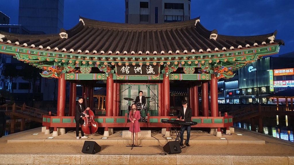 | ▲ 원주문화재단 강원감영 등에서 '재즈인 더 원주' 공연 (원주=연합뉴스) 원주문화재단이 코로나19로 인해 집콕생활을 하며 피로감과 우울감을 느끼는 시민을 위로하고자 명소를 배경으로 색다른 재즈 공연을 준비했다. 사진은 '강원감영'에서의 공연 모습. 2021.4.20 [원주문화재단 제공·재판매 및 DB 금지] |