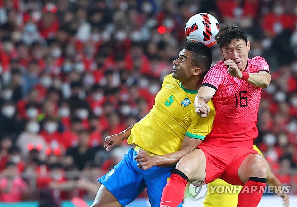 | ▲ 볼경합 벌이는 황의조 카세미루 (서울=연합뉴스) 김도훈 기자 = 지난 6월 2일 오후 서울월드컵경기장에서 열린 남자 축구 국가대표팀 친선경기 한국과 브라질의 경기에서 한국 황의조와 브라질 카세미루가 공중볼 경합을 벌이고 있다. 2022.6.2 superdoo82@yna.co.kr |