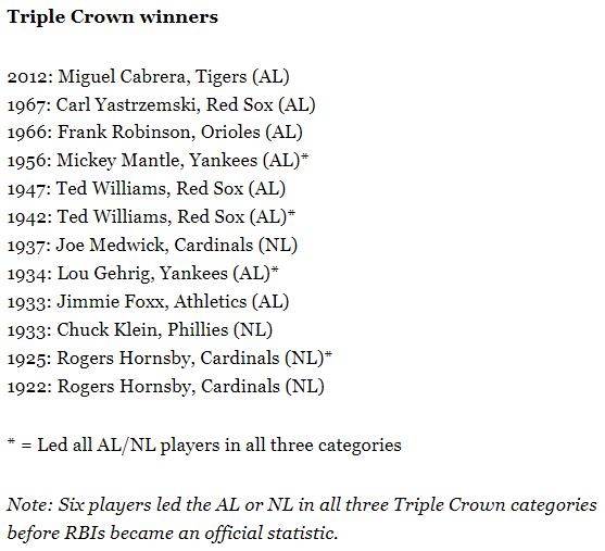 메이저리그에서는 타점이 공식 기록으로 채택된 1920년 이후 총 10명의 타자가 12차례 타격 3관왕을 차지했다.