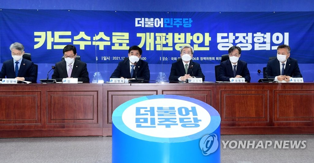 SEOUL, Dec. 23 (Yonhap) -- The government will cut credit card processing fees for small merchants to ease their burdens amid the COVID-19 crisis, the ruling Democratic Party said Thursday following its meeting with financial authorities.