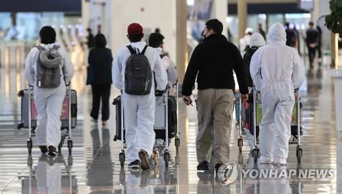 | ▲ 불안한 여행길, 방호복 차려 입국 출국 지난달 28일 인천공항 제1터미널 출국장에서 외국인 관광객들이 코로나19 감염 방지를 위해 방호복을 차려 입고 이동하는 모습. [연합뉴스 자료사진] |