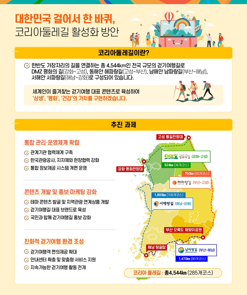 코로나19 시대에 맞는 관광환경을 조성하기 위해 우리나라의 가장자리를 따라 연결한 4천500km 길이의 걷기여행길 '코리아둘레길'을 내년 말까지 구축할 계획이다.