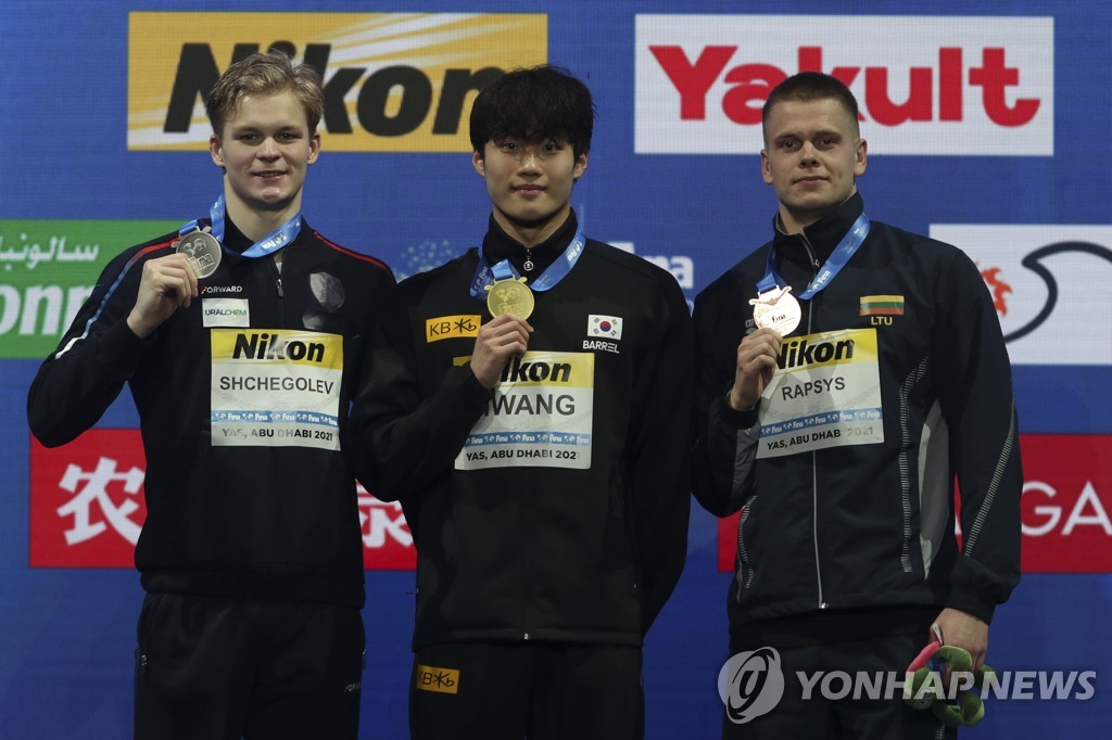 | ▲ In this AP photo, South Korean Hwang Sun-woo (C) stands at the podium with Aleksandr Shchegolev of Russia (L) and Danas Rapsys of Lithuania (R) after the 200-meter freestyle during the FINA World Short Course Swimming Championships in Abu Dhabi, United Arab Emirates, on Dec. 17, 2021. (Yonhap) |