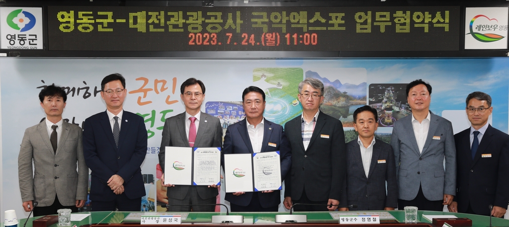 (영동=연합뉴스) 박병기 기자 = 충북 영동군은 2025년 세계국악엑스포 유치를 위해 24일 대전관광공사와 협약했다.